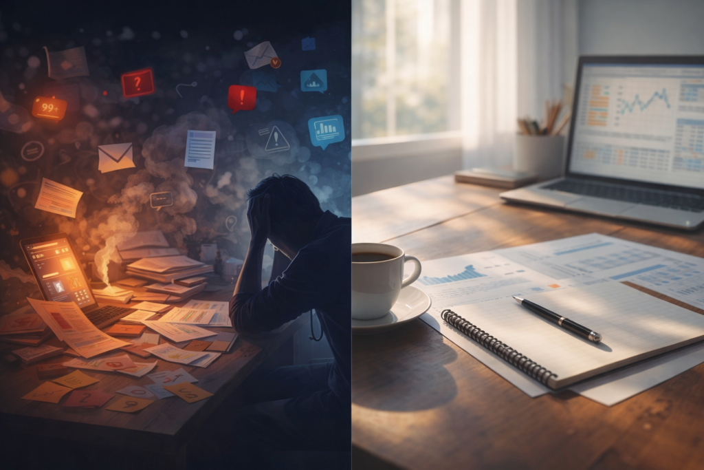 Vivemos num ambiente desenhado para fragmentar foco. A mente chega cansada justamente na hora em que decisões financeiras pedem clareza. Não por falha pessoal, mas por desgaste estrutural.