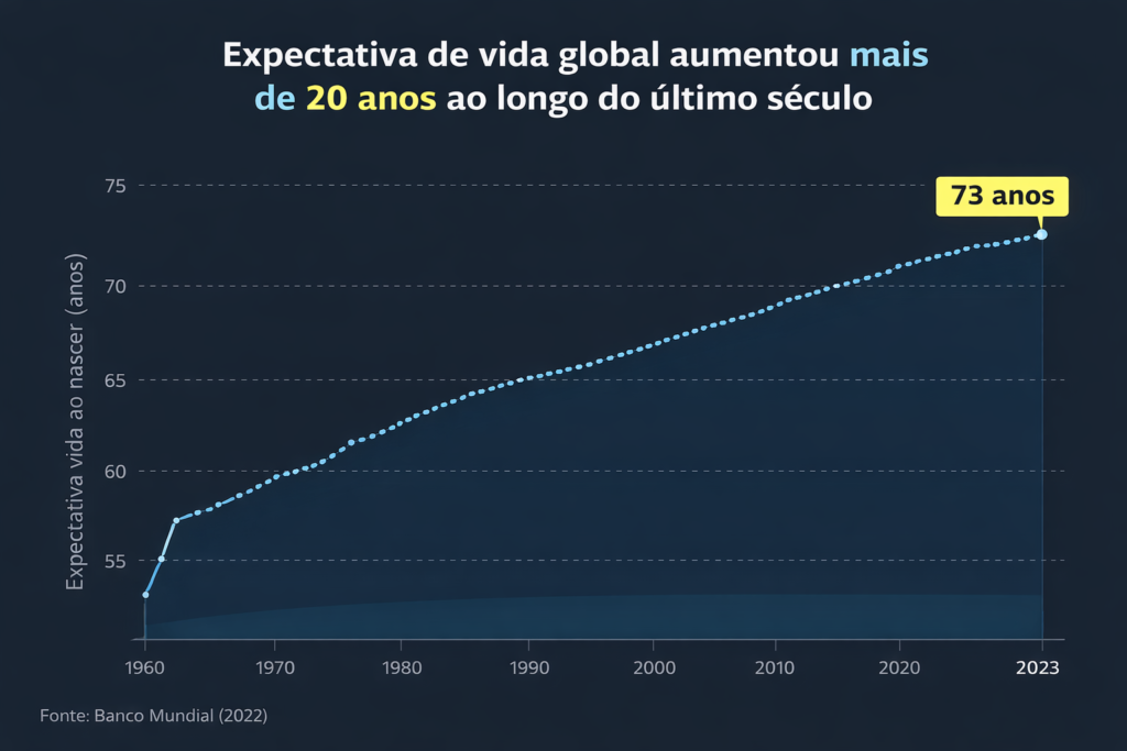 Aqui entra o segundo vetor, quase irônico. Nunca fomos tão eficientes em prolongar a vida. Avanços médicos, saneamento, tecnologia, medicamentos, diagnósticos precoces. O sucesso foi tão grande que criou um problema novo: gente vivendo mais tempo em sociedades que não se reorganizaram para isso.